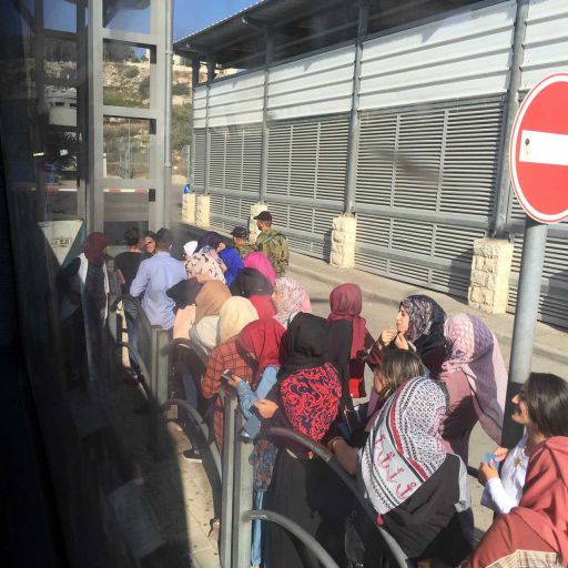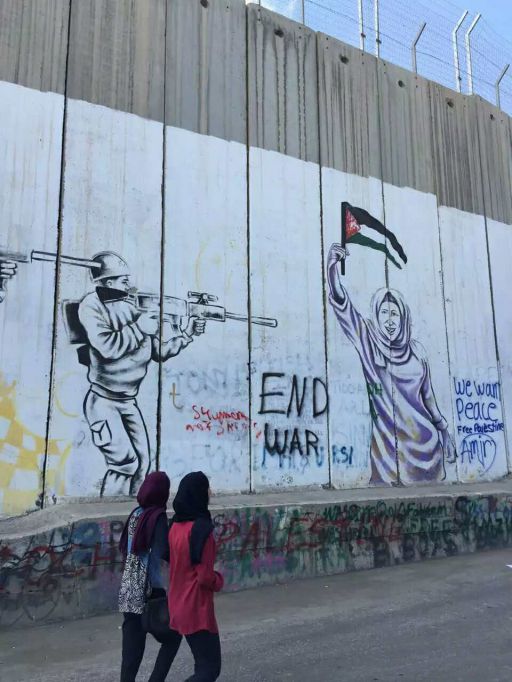 坐的是公共汽车。去程,从耶路撒冷去伯利恒,一路顺畅,没任何检查。但回程,在巴勒斯坦和以色列的边境线上,所有人却都要下车,接受以色列士兵的检查。